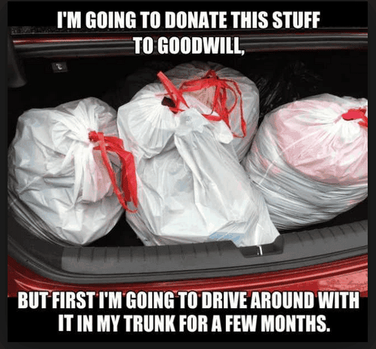 Have you seen this meme on Facebook about driving around for weeks with bags for Goodwill in your car? It’s funny because it’s true.