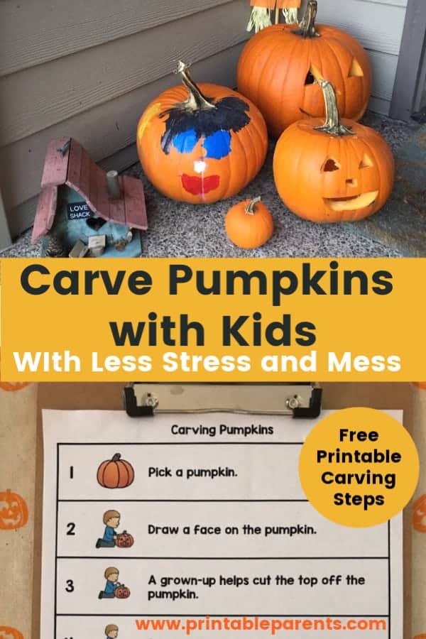 I’ve come up with a better strategy this year. Using a free pumpkin carving steps printable and some simple supplies, you can more peacefully carve pumpkins with your kids this year.