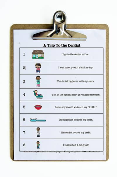 Next I like to place the visual schedule on a clipboard. Then my child can check it off each step at the dentist with a dry erase marker. (Side note: use washable markers and save time and money on laundry stains).