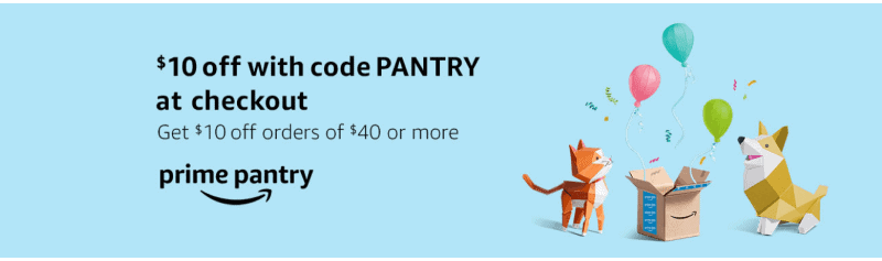 - Amazon is offering a promotion to Get $10 off orders of $40 or more in Prime Pantry by entering code PANTRY at checkout. This is a limited time offer so make sure and get your order in quickly!