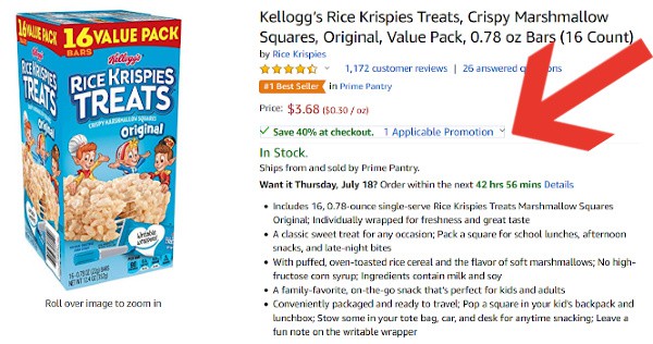 Check out the Amazon Prime Pantry Coupon page and clip any eligible coupons you might use. I found a 40% off coupon for Rice Krispies treats that would make a great deal. This particular item wasn’t part of the Buy More, Save More promotion so be aware of that.