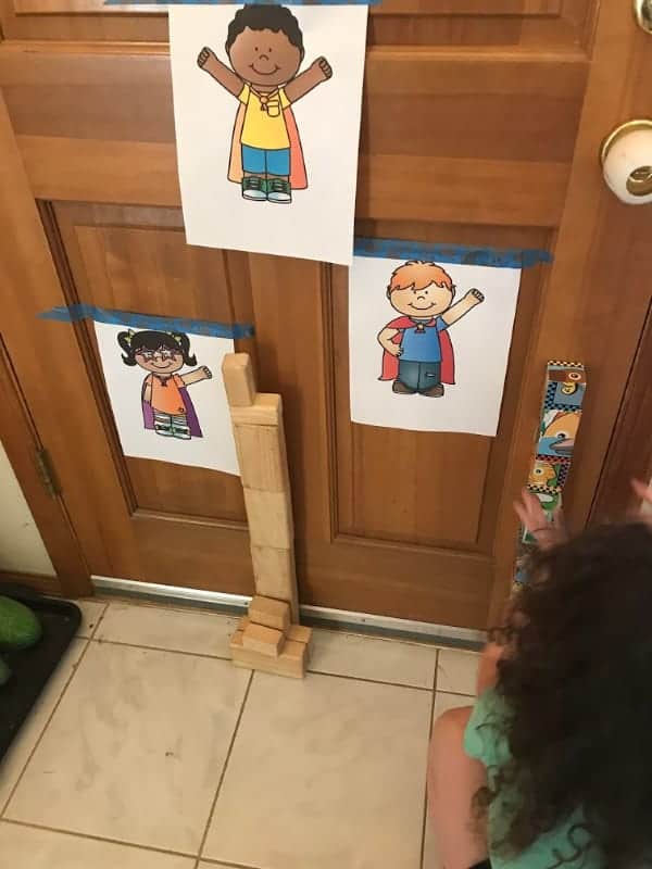 Since superheroes can leap over the tallest buildings, challenge your children to build block towers. Just print out or draw some super heroes, tape them at varying heights to the wall, and set out your blocks.