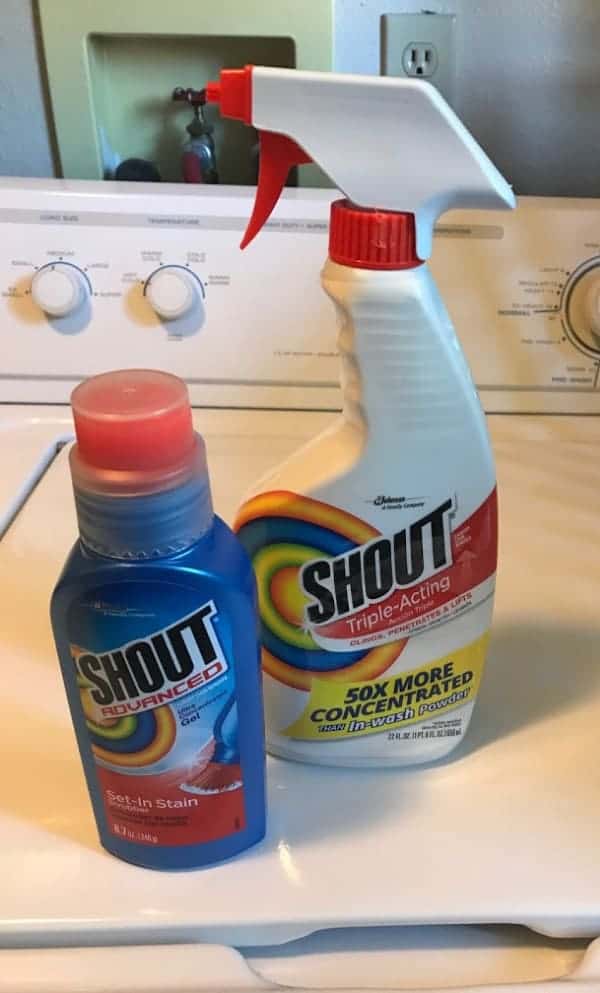 Then I can quickly treat a bunch of stains at once in under two minutes. I’ve had the best success using Shout spray and Shout Advanced with a built-in scrub brush for stains.