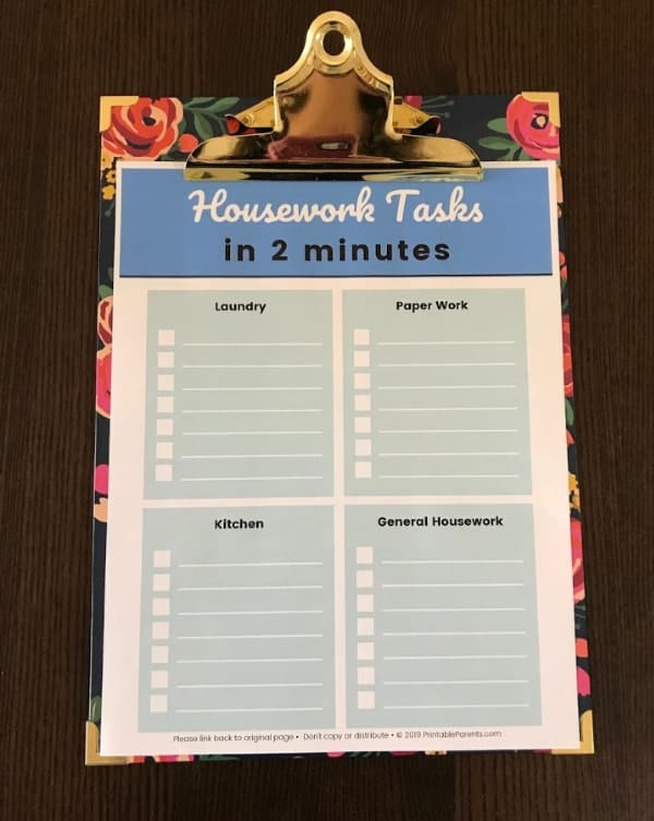 Everyone’s home and stage of life is different so I included a blank printable for you to use as well. Print out this list and regain some control of your house. With two minute housekeeping tasks, you can reduce your housework overwhelm and find time for what you really love.